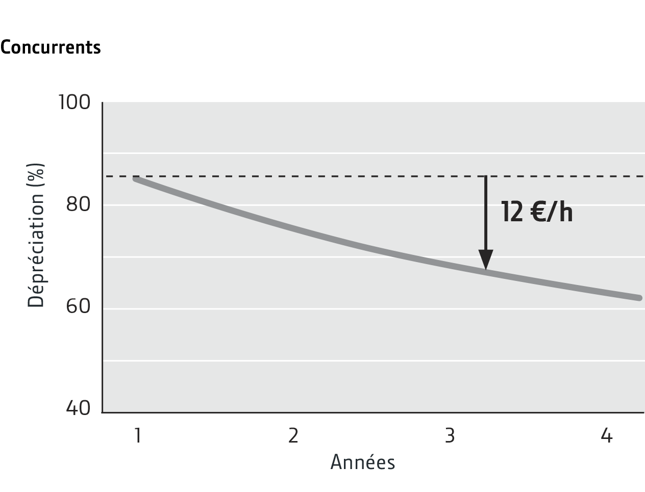 Les prix moyens de revente sur Internet1 des marques concurrentes montrent une dépréciation moyenne de 12 €/h.