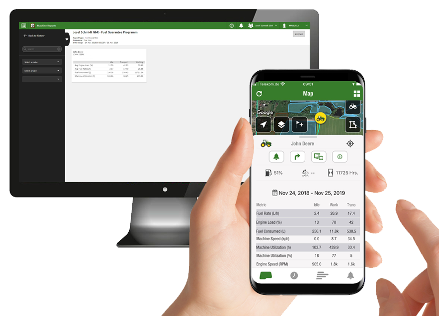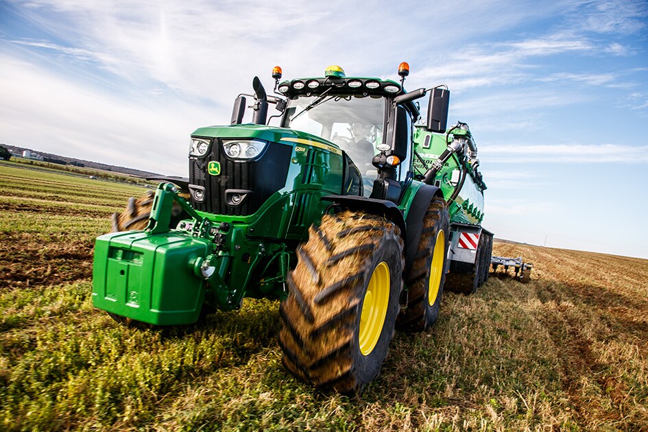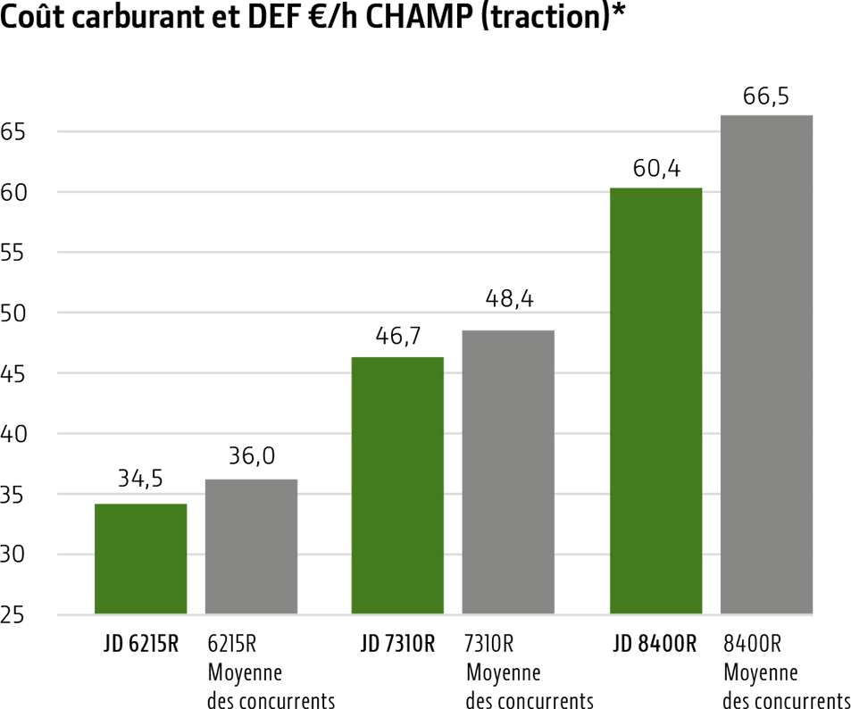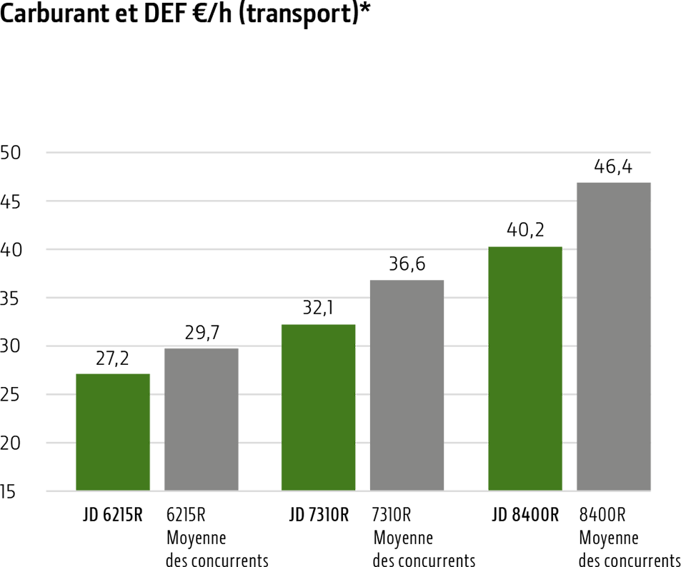 2 Le programme Fuel Guarantee est proposé uniquement par les concessionnaires John Deere participants du 1er novembre 2020 au 31 octobre 2021, pour tous les tracteurs des séries 6R (6 cylindres), 7R et 8R neufs et encore jamais vendus, achetés ou loués entre ces dates. Vous devez vous inscrire spécifiquement au programme en ligne pour en bénéficier. Le programme Fuel Guarantee est valable pour les applications de travaux au champ et de transport (à une vitesse supérieure à 20 km/h), conformément aux données JDLink fournies. La mesure incitative ne s’applique qu’à la première année de possession. John Deere remboursera au client la différence entre sa consommation moyenne réelle en transport et la consommation de carburant cible. Si la consommation réelle dépasse la valeur ciblée, le remboursement sera à la hauteur du nombre de litres additionnels consommés ; si elle est inférieure, le montant du remboursement sera égal à la moitié des litres non consommés. Le bonus est limité à un maximum de 10 000 €. Contactez votre concessionnaire John Deere pour en savoir plus sur la procédure d’inscription.