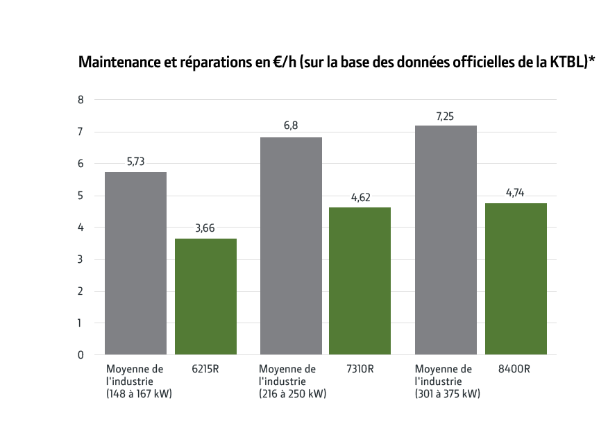 1 Calcul interne effectué en 2017 par John Deere sur la base des données recueillies auprès d’Agriaffaires, Traktorpool, Mascus (avril / mai 2017). Les deux courbes d’amortissement sont le résultat de l’utilisation d’une régression non linéaire multivariable. Calcul pour un modèle 6R Grand châssis et des modèles concurrents comparables. Le prix d’achat est estimé à 130 000 €. Utilité de 1 000 heures par an sur 4 ans. http://www.agriaffaires.com; www.traktorpool.de; www.mascus.com.