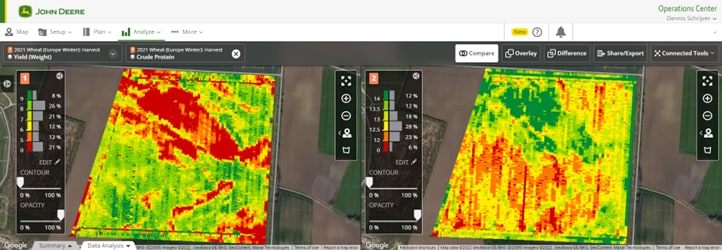 Carte des protéines et du rendement (droite) affichée dans l’Operations Center