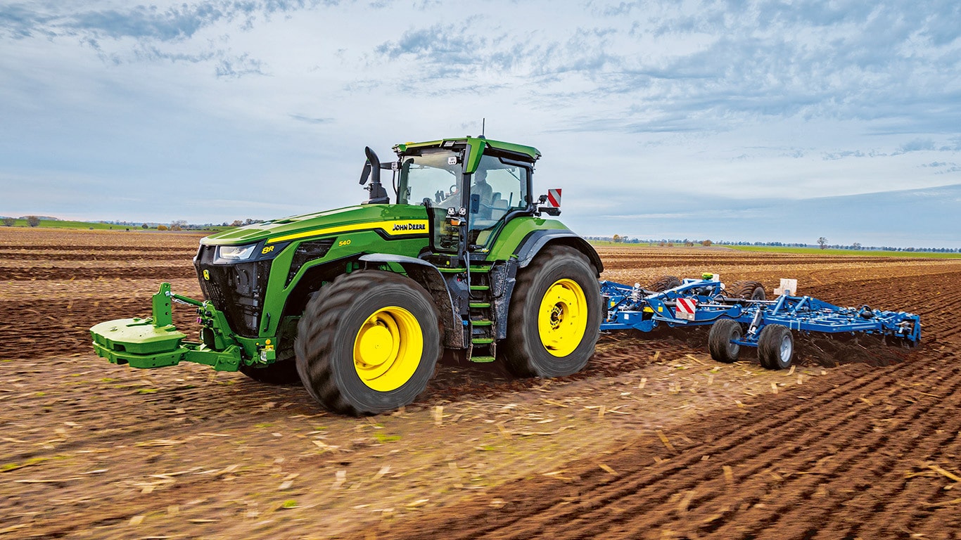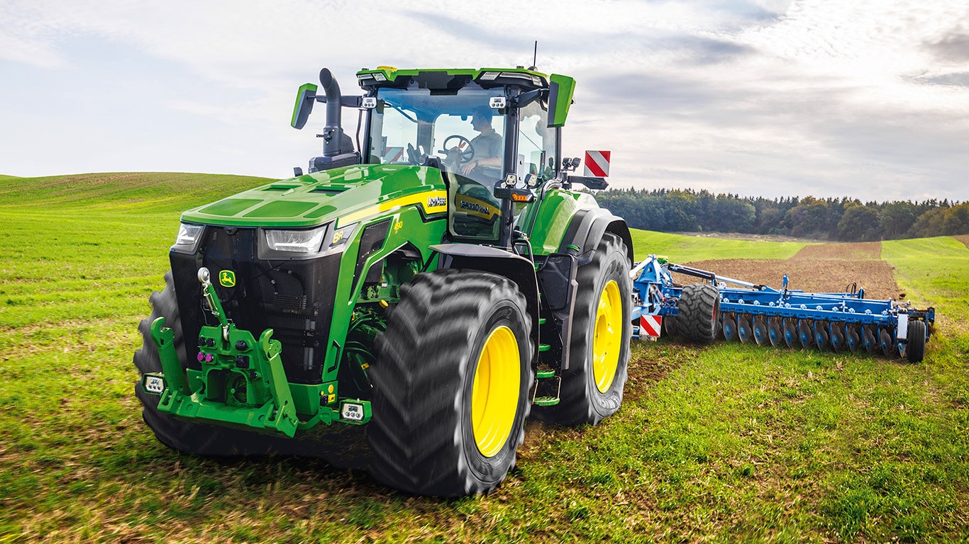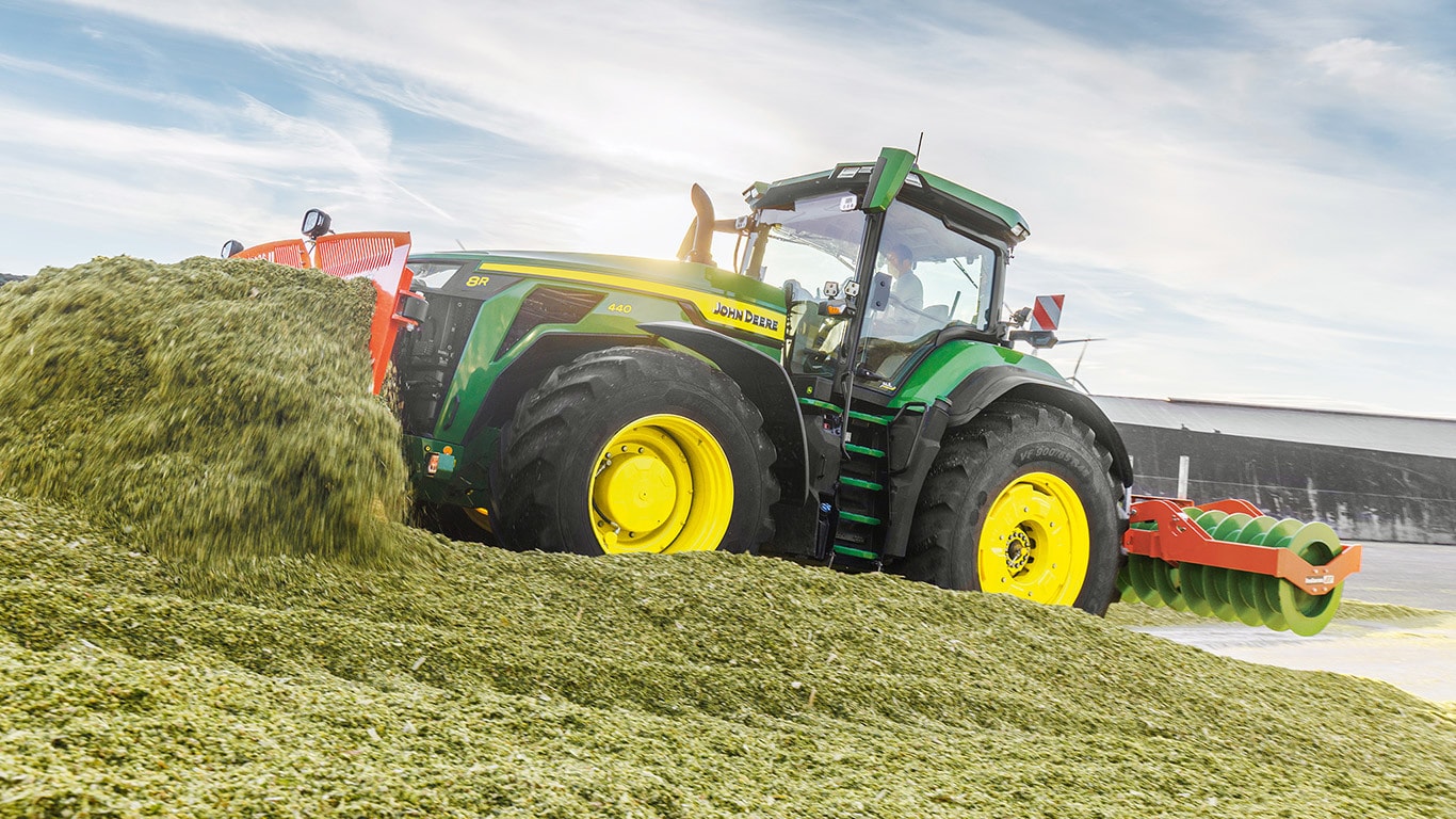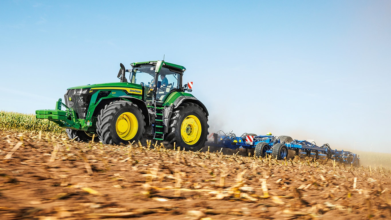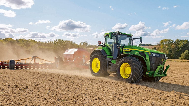 Les nouveaux tracteurs 8R de haute puissance fournissent la puissance de traction dont vous avez besoin pour les équipements les plus exigeants. Avec la gestion intelligente de la puissance de crête, le moteur JD14 fournit jusqu’à 634 ch exactement au moment où vous en avez besoin pour une productivité optimale dans n’importe quelle condition. La transmission eAutoPowr™ unique offre une accélération continue et un transfert de puissance jusqu’à 8 % supérieur par rapport aux transmissions hydrauliques et à variation continue standard. Le nouveau tracteur 8R de grande puissance est équipé de pneus arrière de 2,30 m, de pneus avant de 1,85 m et du système centralisé de gonflage des pneus (CTIS) à conduite unique pour un transfert de puissance et une polyvalence supérieures, et pour mieux préserver le sol.